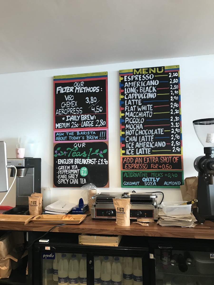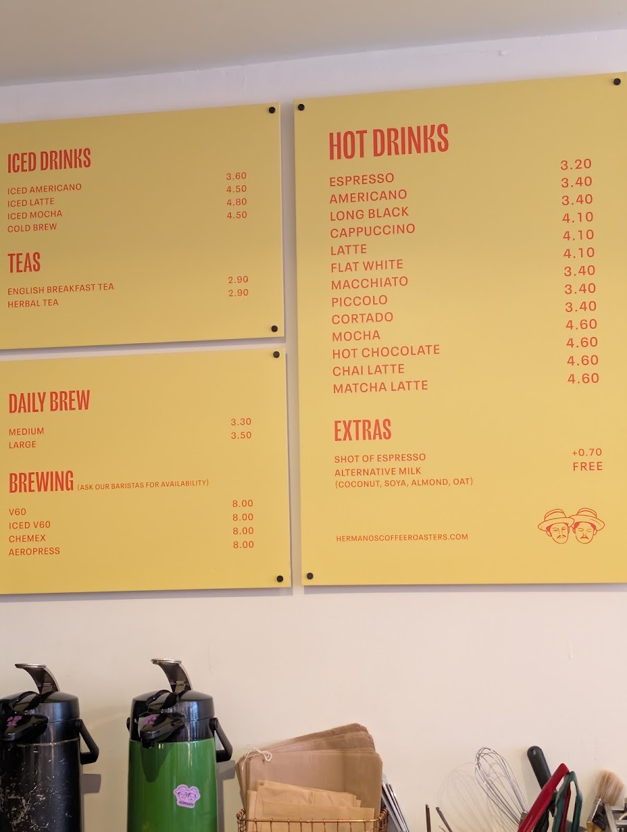 The menu at Hermanos Colombian Coffee Roasters - Barnes offers a well-rounded selection for coffee lovers and tea enthusiasts alike. For those seeking refreshing beverages, the Iced Americano, Iced Latte, and Iced Mocha are excellent choices, alongside the smooth Cold Brew. Hot drink options are abundant, with classics like Espresso, Americano, and Long Black, or creamier options such as Cappuccino and Latte. If you’re a tea drinker, the menu features comforting choices such as English Breakfast Tea, Herbal Tea, and additional options like English Breakfast, Green Tea, Earl Grey, and the spicy Chai Tea. For those looking to customize their drink, extras such as a Shot Of Espresso or Alternative Milk are available. The brewing methods include stylish choices like V60, Iced V60, Chemex, and Aeropress, perfect for those who enjoy a more artisanal experience.